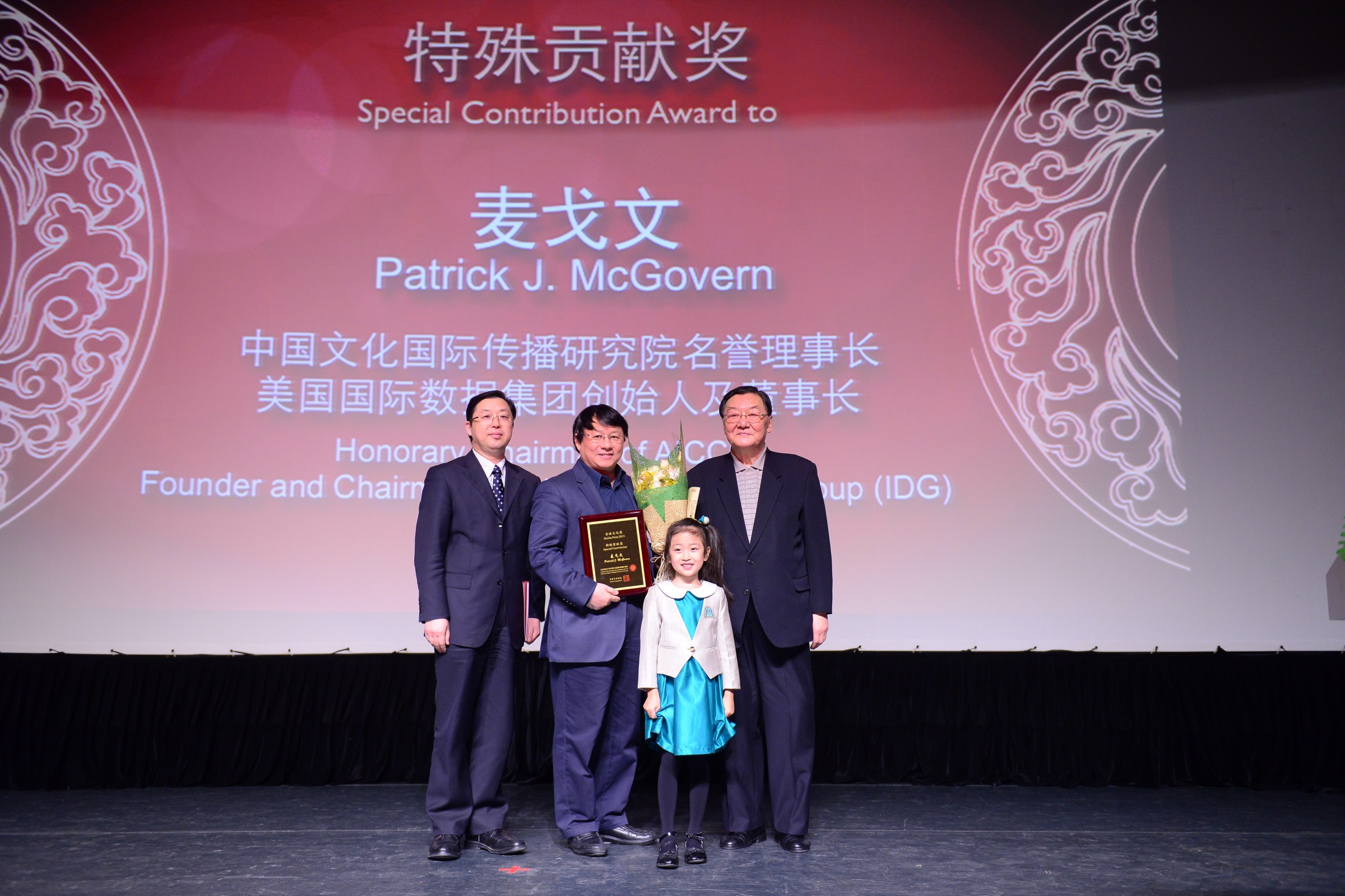 IDG创始人、中国文化国际传播研究院捐资人之一、研究院名誉理事长麦戈文先生获得“特殊贡献奖”。北京师范大学副书记刘利宣读颁奖词,认为麦戈文在中国捐建了大量公益项目,他对中国文化的大爱和对国际传播的实践,赢得了世人广泛尊重。重大革命和历史题材影视创作领导小组成员、国家电影审查委员会委员、全军艺术指导委员会委员翟俊杰为其颁发“特殊贡献奖”,IDG全球副总裁、亚洲总裁、IDG资本创始合伙人熊晓鸽代表麦戈文先生领奖。