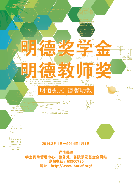 北京师范大学学生资助管理中心“关于开展第二届(2014年度)明德奖学金推荐工作的通知”链接: