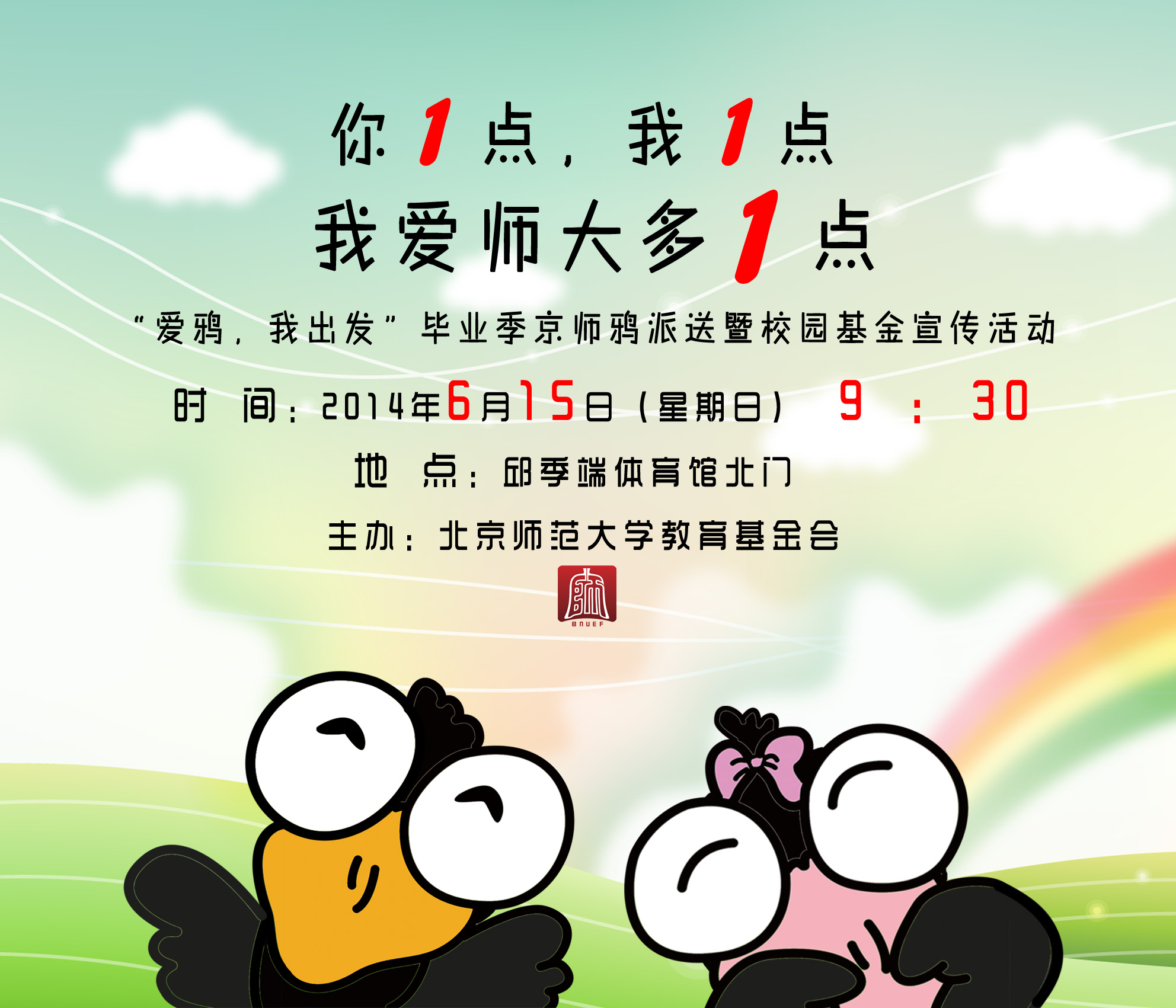 “爱鸦,我出发”毕业季礼物派送,6月15日,仅此一天,机不可失!京师鸦派送活动和毕业季小额捐赠将同时进行,心意自愿,1元起捐,捐赠款将全额用于我校校园基金项目。