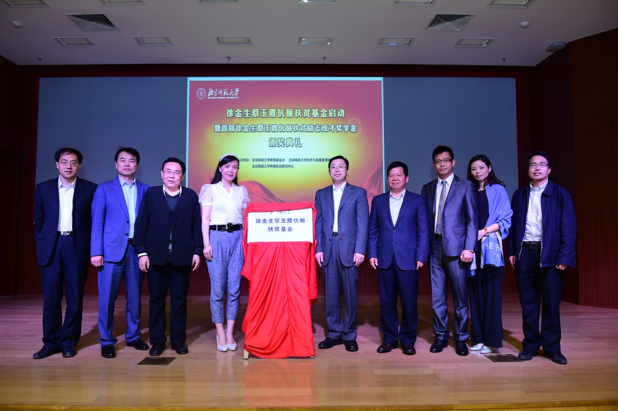 2015年4月24日,“徐金生蔡玉霞伉俪扶贫基金启动暨首届徐金生蔡玉霞伉俪扶贫励志成才奖学金颁奖典礼”在我校京师学堂举行。国务院扶贫办中国国际扶贫中心副主任黄承伟、澳门台商联谊会会长徐静慧、澳台商会副会长何廣治、欧阳玲伉俪、澳门日报张玉书应邀出席。我校党委副书记刘利、党委宣传部部长方增泉、经济与资源管理研究院党总支书记张琦、教育基金会秘书长张吾龙及相关职能部处负责人出席了典礼。典礼由经济与资源管理研究院名誉院长李晓西教授主持。