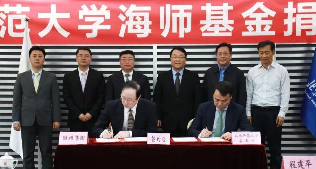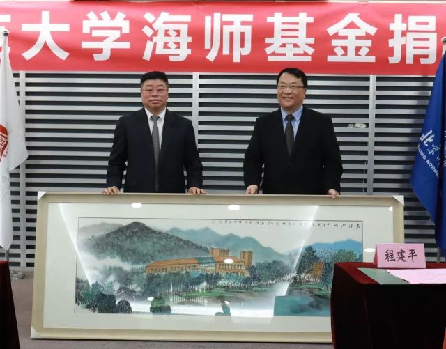 捐赠仪式上,国维集团珠三角区域公司总裁于夫与北师大教育基金会秘书长张吾龙共同签署了海师基金捐赠协议。史董事长与程书记互赠了支票牌、捐赠证书后,程书记赠送了以珠海校区凤凰山谷和丽泽楼为创作背景的国画《丽泽湖畔》以示纪念。