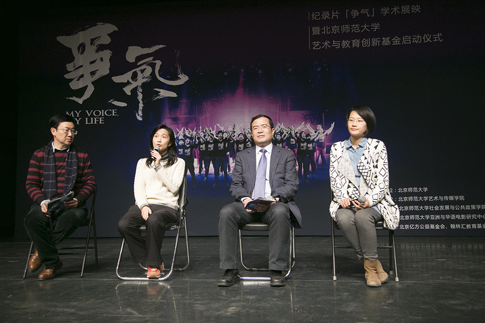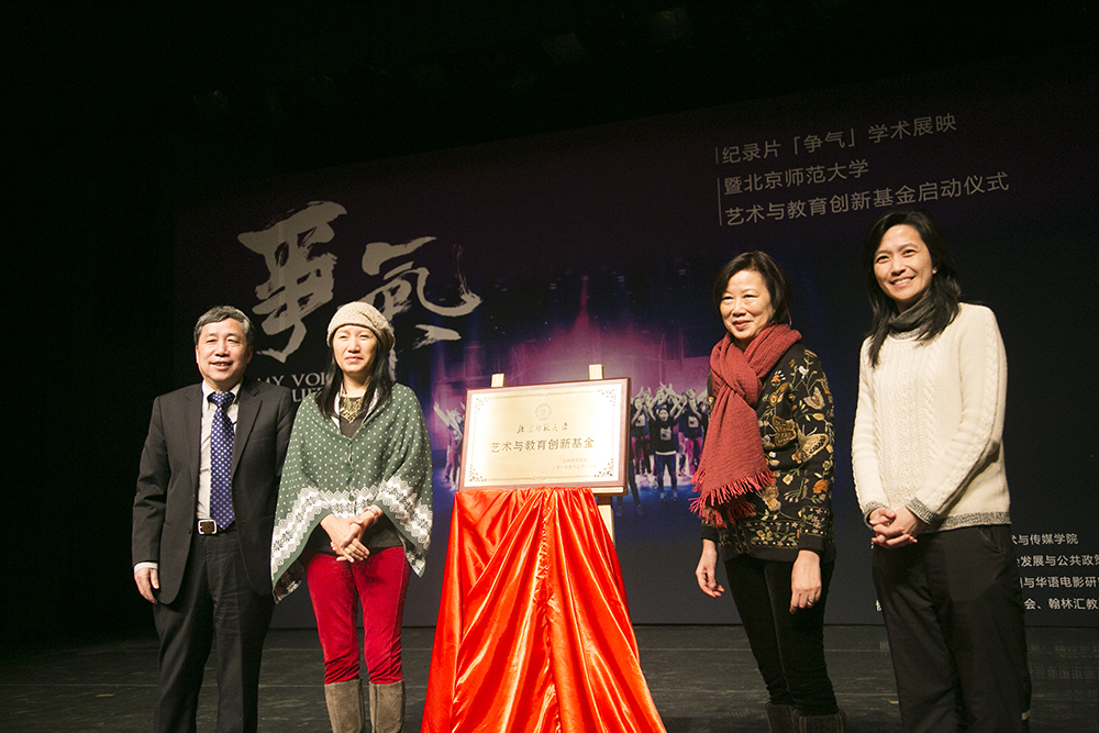 展映结束后,纪录片监制何静莹女士、北京市西部阳光乡村发展基金会秘书长来超、艺术与传媒学院院长周星、教育学部部长石中英与在场的嘉宾进行了互动,发言中纷纷表示被纪录片所触动并给予了影片高度的评价。随后,陈光巨副校长宣布北京师范大学艺术与教育基金启动,并与香港大学发展及校友事务部总监兼任香港大学教研发展基金策划总监徐咏璇女士,《争气》导演杨紫烨女士,监制何静莹女士共同为基金揭牌。