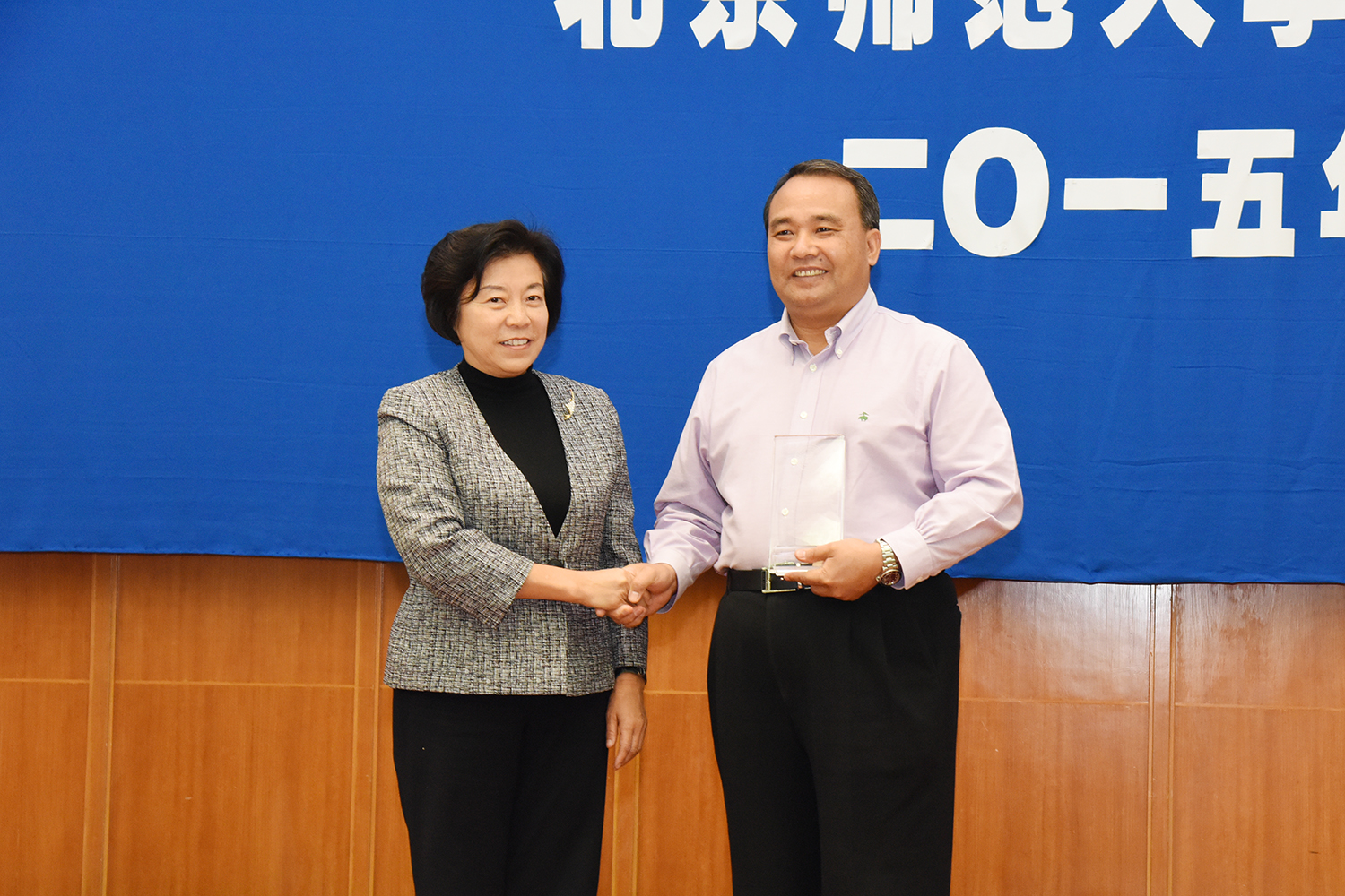 刘川生书记向薛行远总裁赠送“北京师范大学教育发展特别贡献奖”奖牌