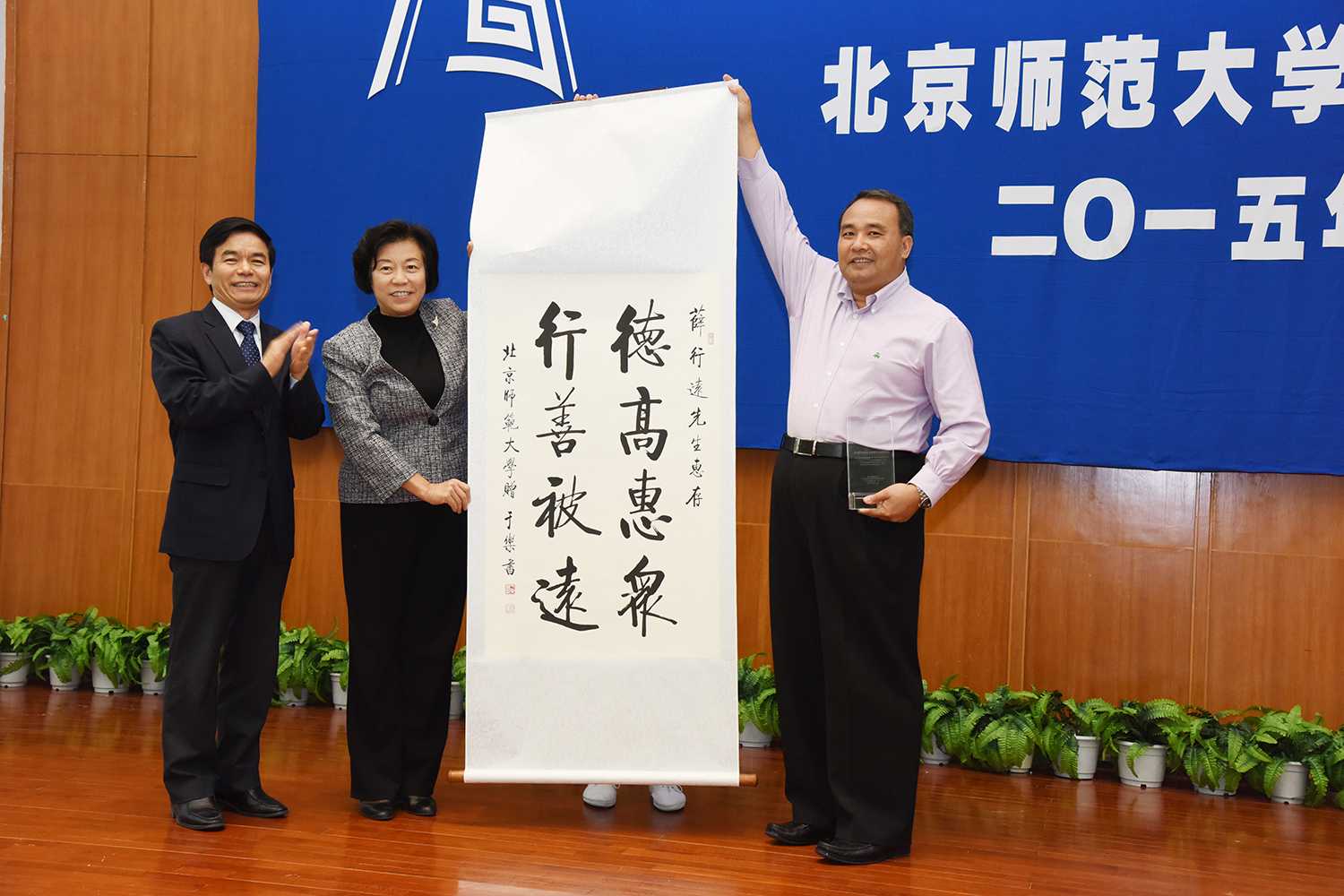 刘川生书记向薛行远总裁赠送了“北京师范大学教育发展特别贡献奖”奖牌,用以感谢薛行远先生为中国教育事业做出的突出贡献;同时刘川生书记和董奇校长向薛行远总裁赠送我校青年书法家、书法系于乐老师的书法作品“德高惠众行善被远”,以作纪念。