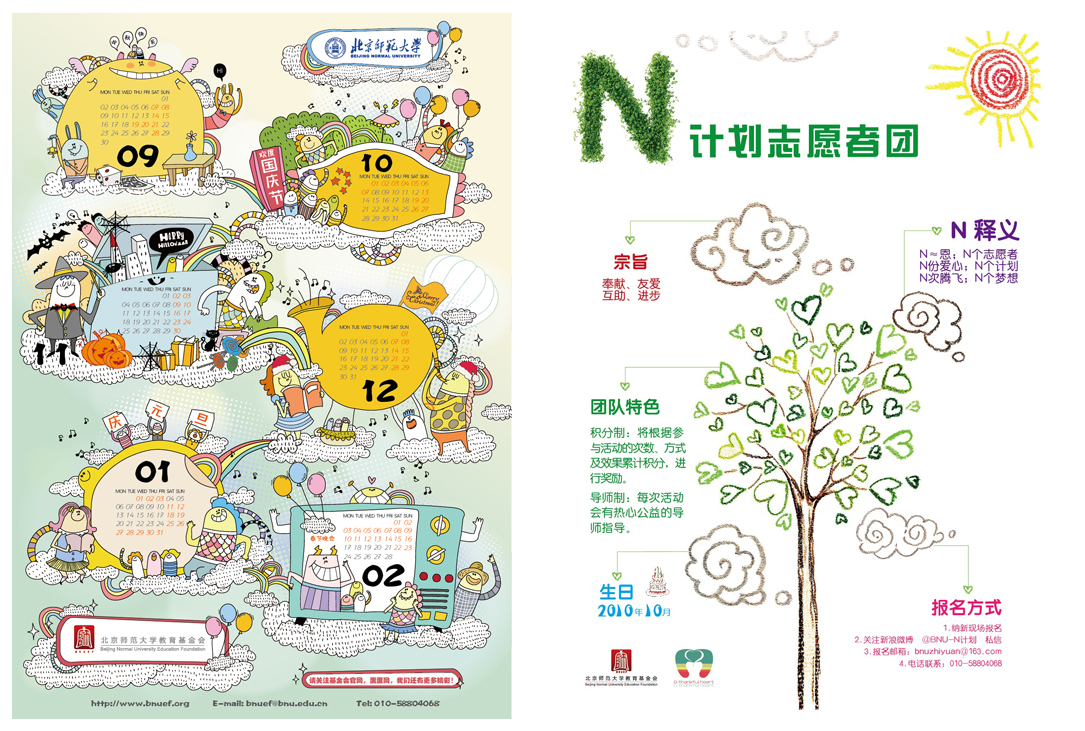 活动中,基金会、“N计划”志愿者团通过海报和宣传手册向广大新生及家长介绍了“N计划”志愿者团的基本情况以及奖助学金的申请资格、流程等,并为新生准备了精心设计的卡通校历、卡包等礼品。活动现场还设置了“你1点,我1点,关爱师大多1点”小额捐赠箱,为大病救助基金和学生创意活动基金继续募款,此外还有“N计划”志愿者团招新、爱心瞬间收集等多个活动环节。