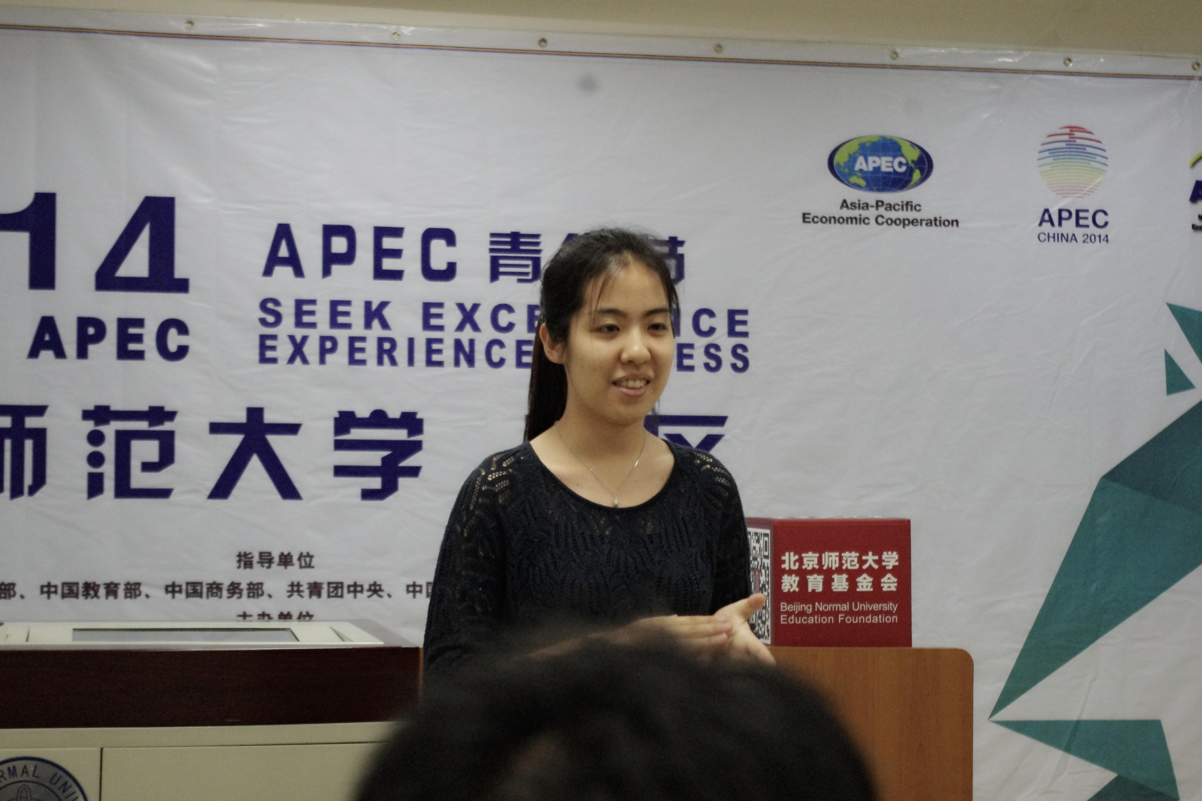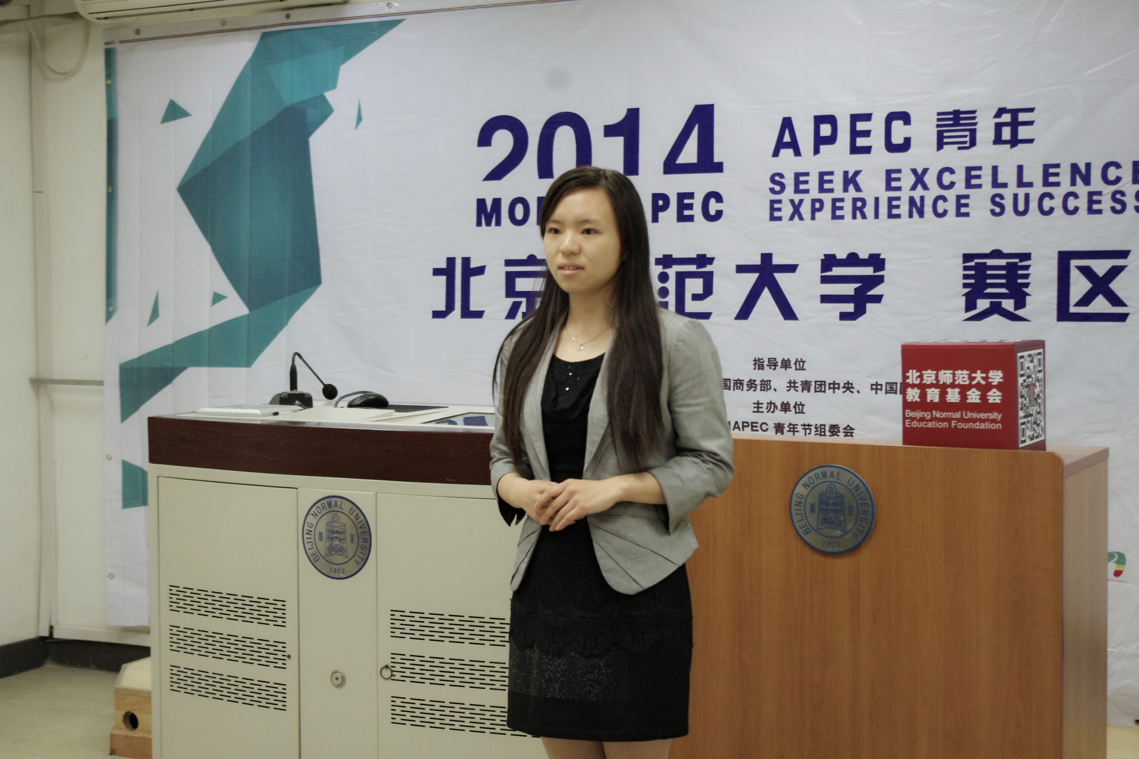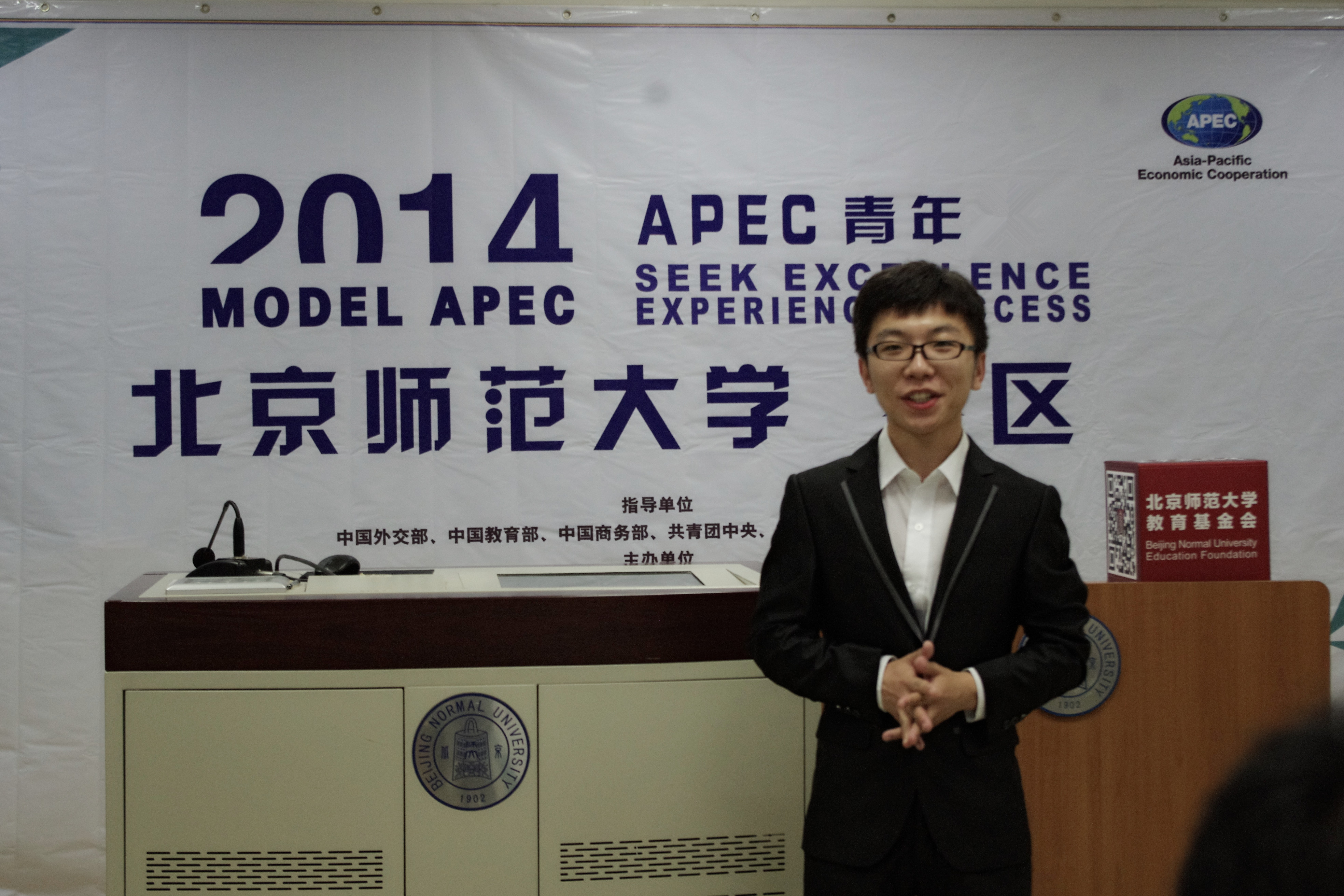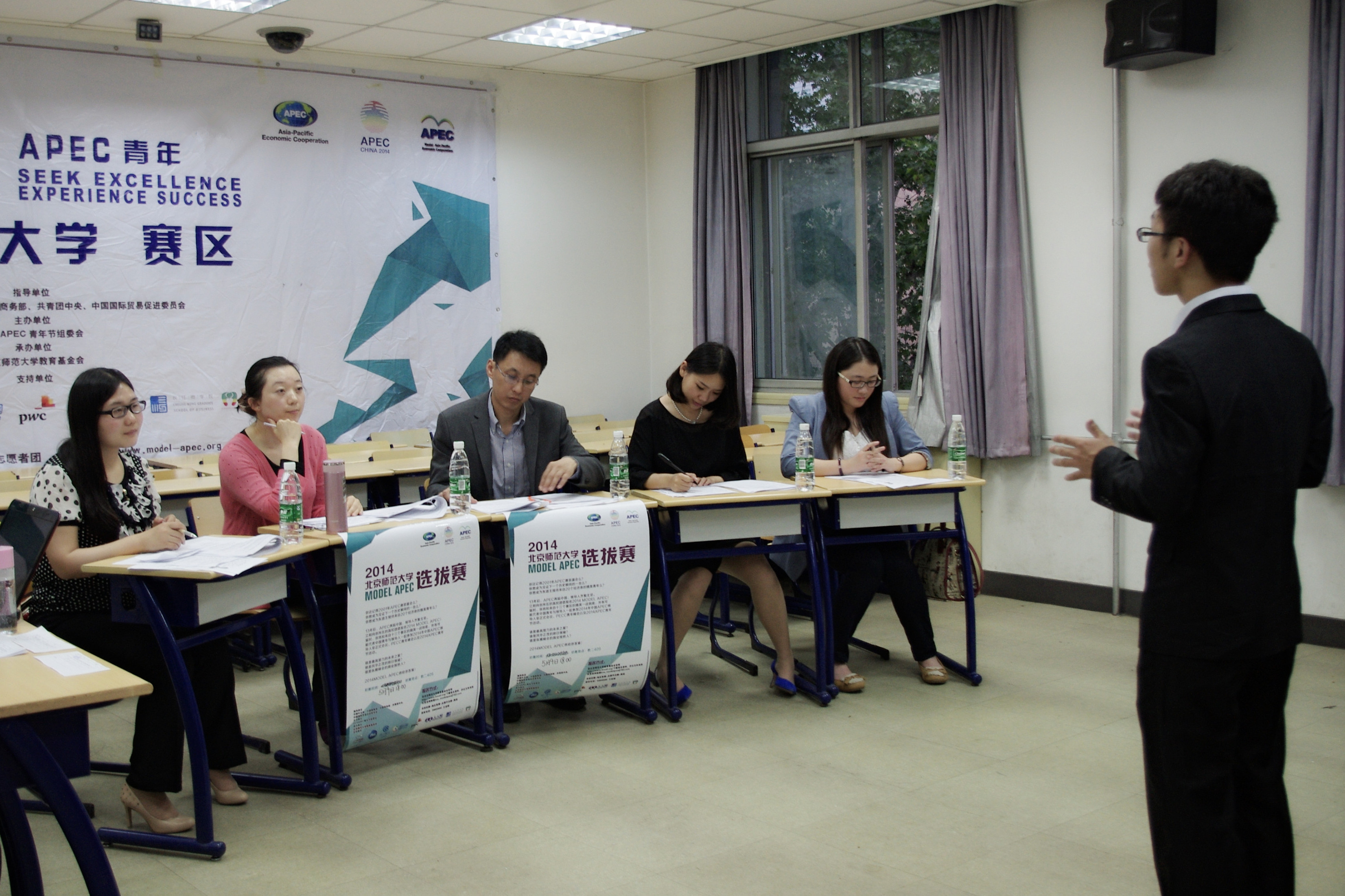 2014年5月9日晚6点,MODEL APEC青年活动北京师范大学选拔赛在我校如期举行。比赛由教育基金会N计划志愿者团组织,邀请MODEL APEC组委会赵由冉老师、我校经济与工商管理学院杨澄宇副院长、教育学部教师教育研究所曹夕多老师,以及我校英语系优秀研究生担任评委。比赛全程采用英文对话,参赛选手们充分表现出了自己饱满的热情、充分的自信和卓越的专业水平,前三甲已经诞生并将代表学校参加北京市MODEL APEC地区复赛。
