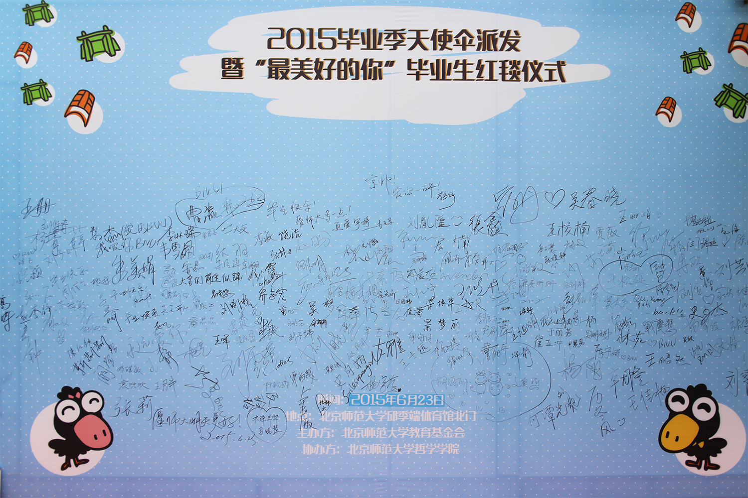 6月23日上午,2015年毕业季天使伞派发暨“最美好的你”毕业生红毯仪式在邱季端体育馆北门举行。北京师范大学教育基金会秘书长张吾龙与来自11个院系的14名教师代表及数百名学生出席了启动仪式。
