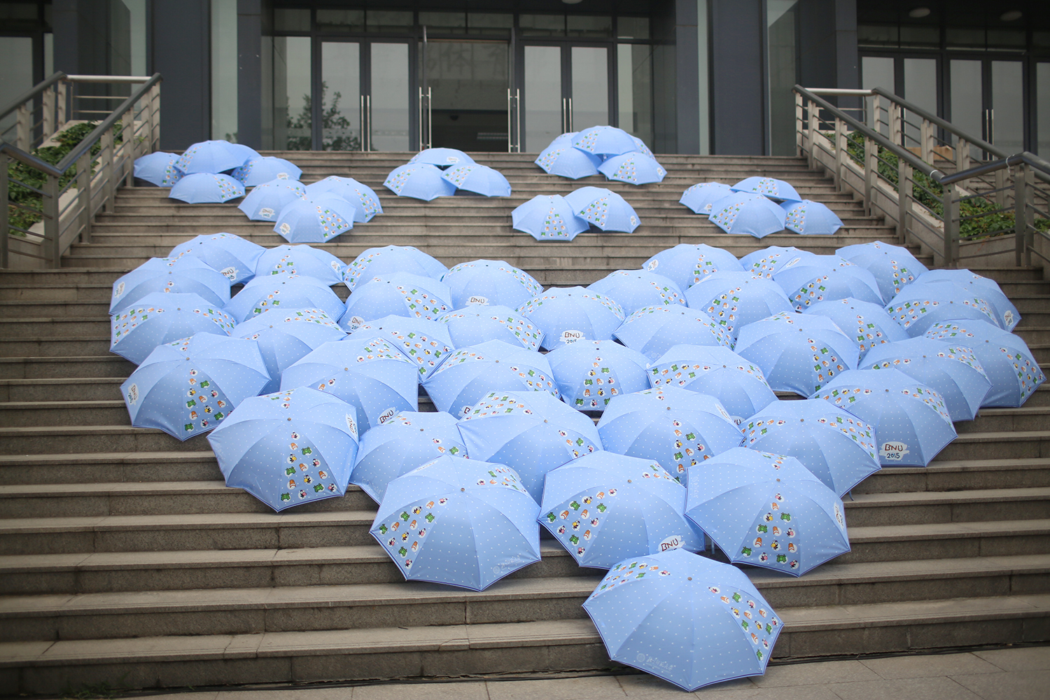在启动仪式上,学生设计代表朱子璇同学给我们介绍天使伞的寓意。天使伞以悠悠的蓝色为主色调,点缀以浅浅的白色斑点,象征着母校师大不张扬不高调的文化底蕴;天使伞上的“京师鸦”、“木铎钟”和“主楼”图案元素代表陪伴了师大学生走过的4年、3年,甚至是7年或10年的青春时光。代表着北师大专属心意的天使伞,蕴含着师大对2015届毕业生的承诺:即使前方的道路坎坷曲折,即使白雾缭绕一片迷茫,母校北师大愿为你们遮风挡雨,给你们坚定的信念;不论你们走到哪里,母校犹如天使,永远在你们的心灵深处,与你作伴。
