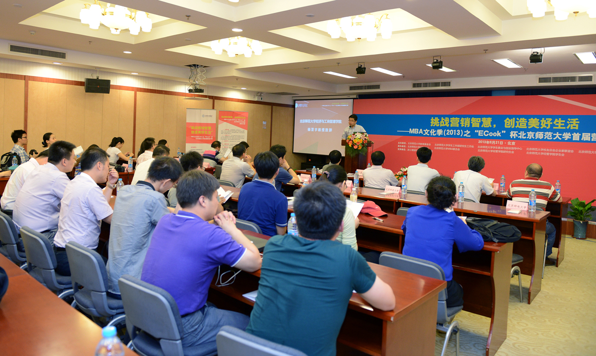 2013年6月21日,我校经济与工商管理学院组织的2013年度MBA文化季(2013)——“ECook”杯北京师范大学首届营销大赛开幕式在京师大厦第六会议室隆重举行。校友企业家胡金高学长、经管学院副院长杨澄宇教授、市场营销系主任孙川教授、经管学院团委书记张璇老师、教育基金会项目管理部部长何恩基老师、学生工作部研究生工作处孙斌杰老师及50余位MBA同学参加开幕式。开幕式由北师大MBA中心主任苏淞老师主持。本次活动还吸引了20多家新闻媒体、各MBA兄弟院校参加。
